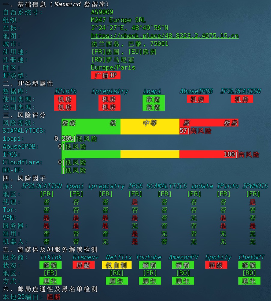 IP查询结果,显示为机房IP,IP还算比较干净的