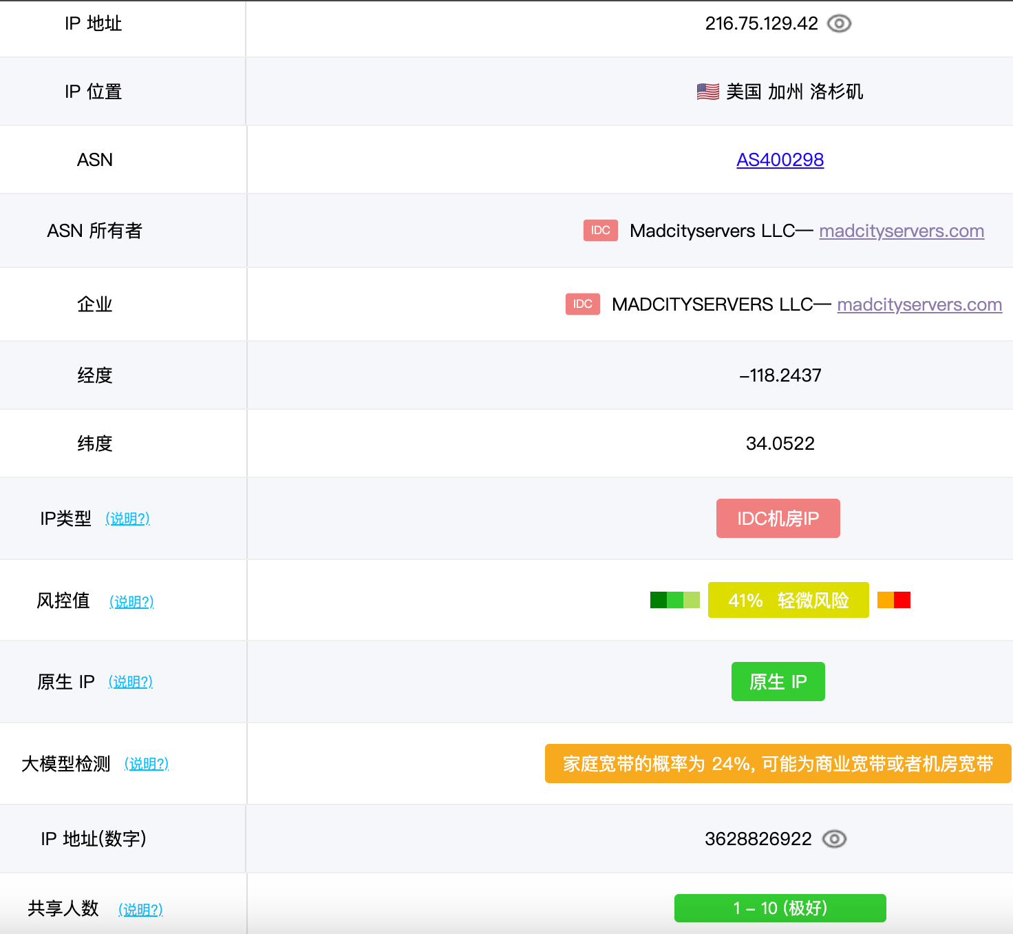 IP查询可以看到这个IP为机房原生IP,IP风险一般般