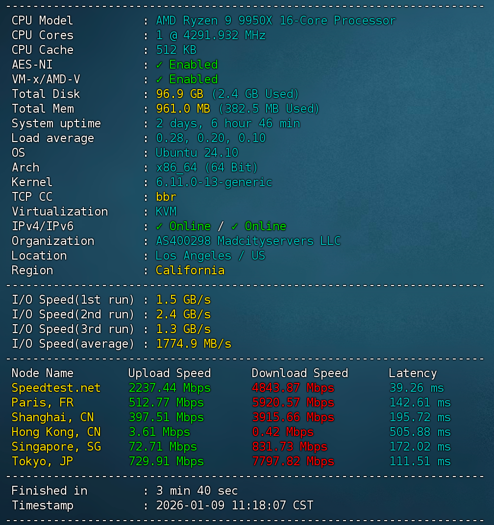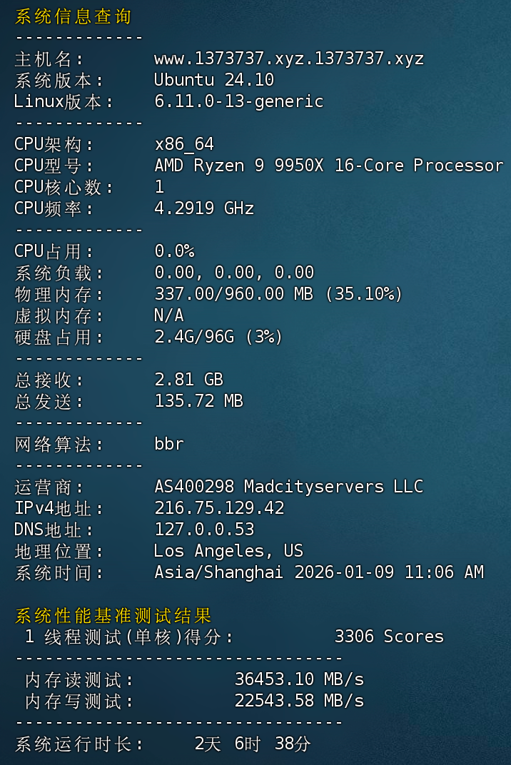 测试机器信息:LAX AMD Standard套餐,$3.5/月(1核,1G内存,100GB NVMe SSD,无限流量)