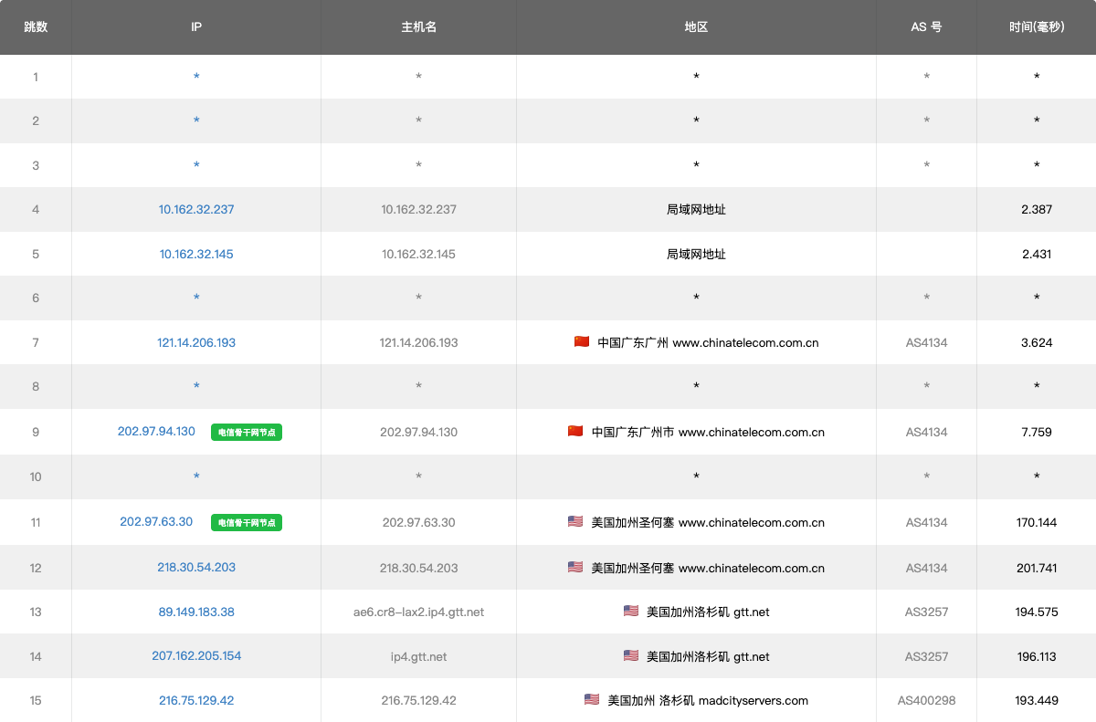 8-9 161.68ms 202.97.*.* AS4134 [CHINANET-BB] 中国 广东 广州 chinatelecom.com.cn 电信
