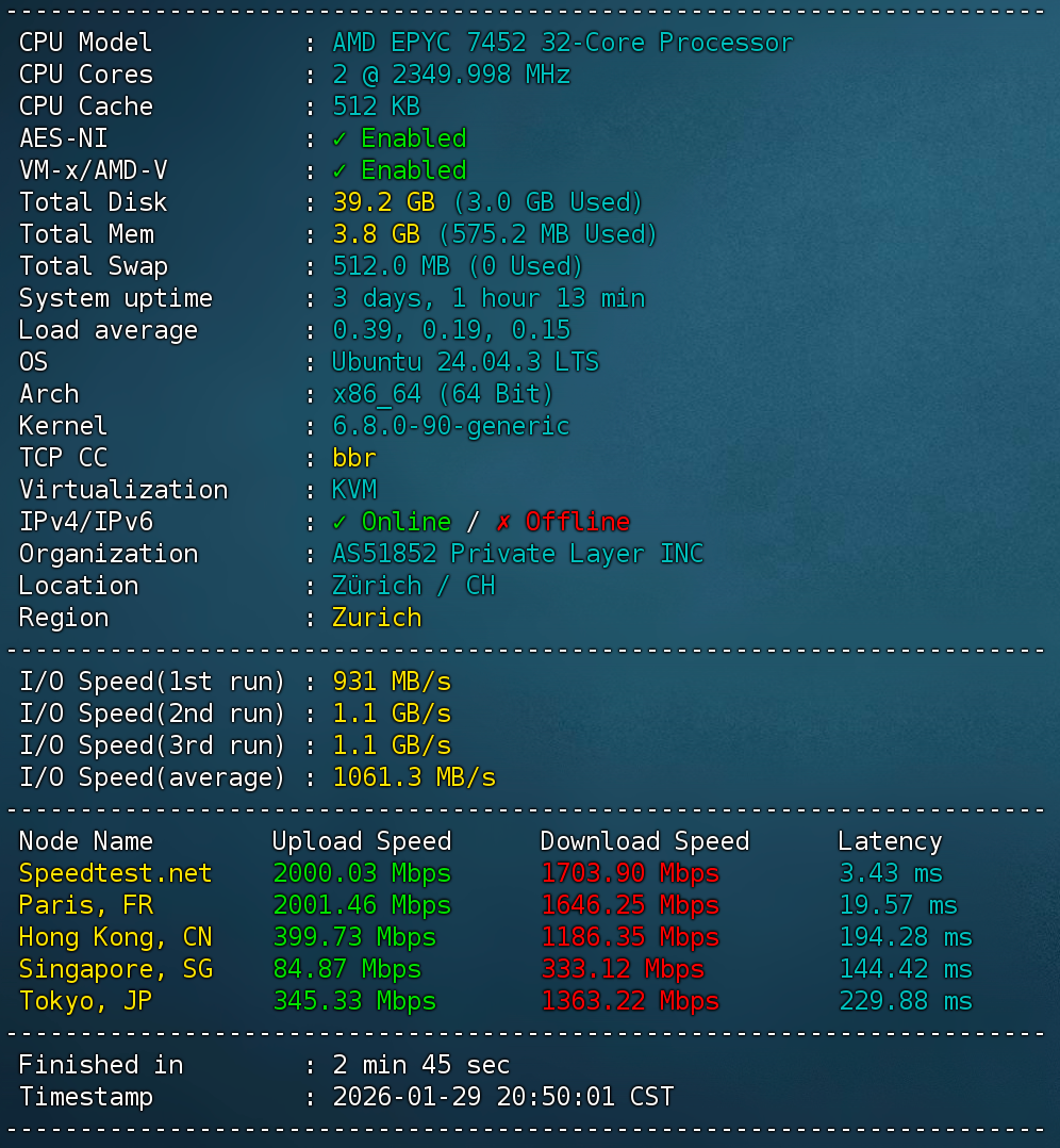 测试机器信息:瑞士定制测试套餐,$8.88/月(2核,4G内存,40GB SSD,2T流量)