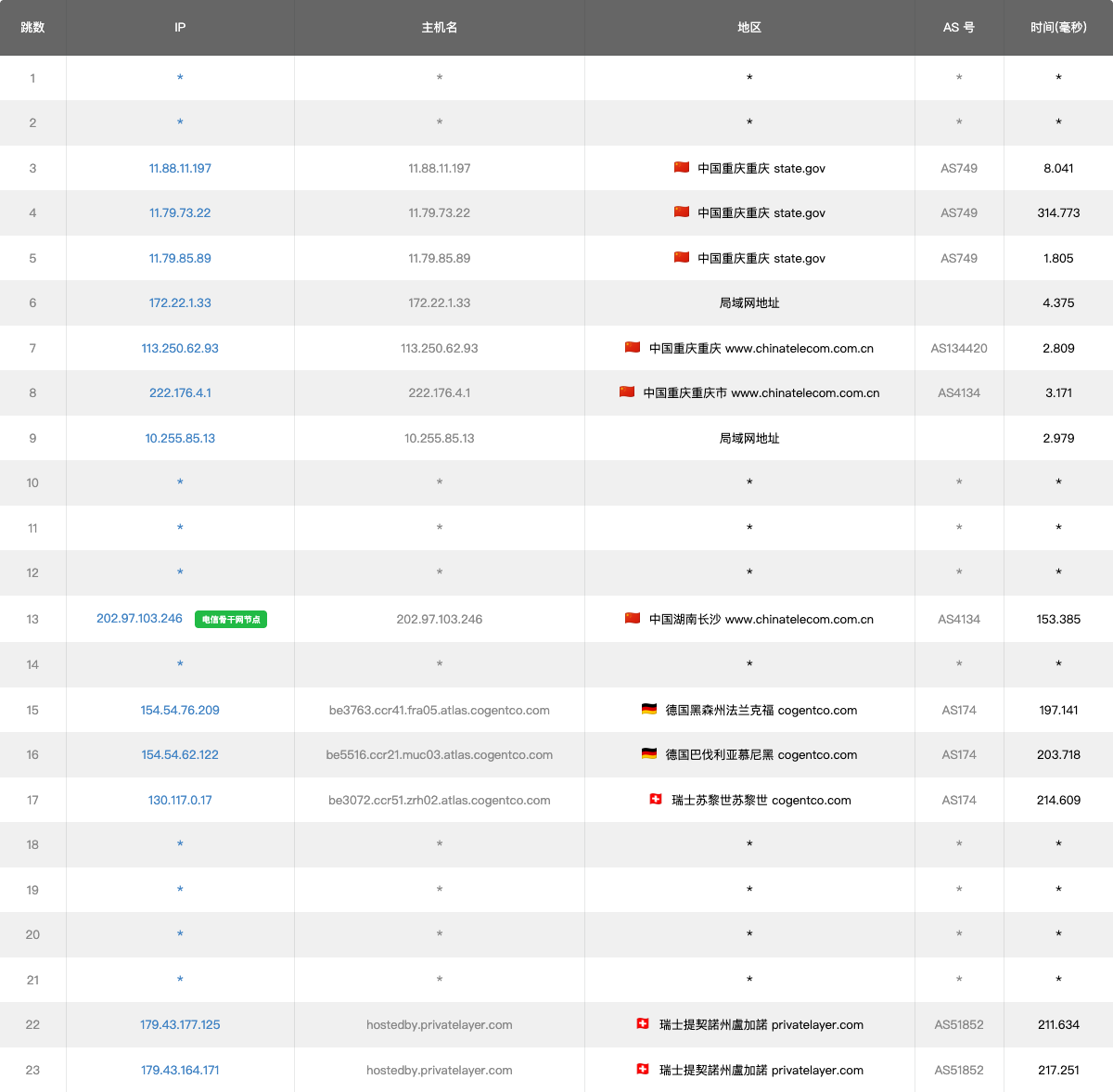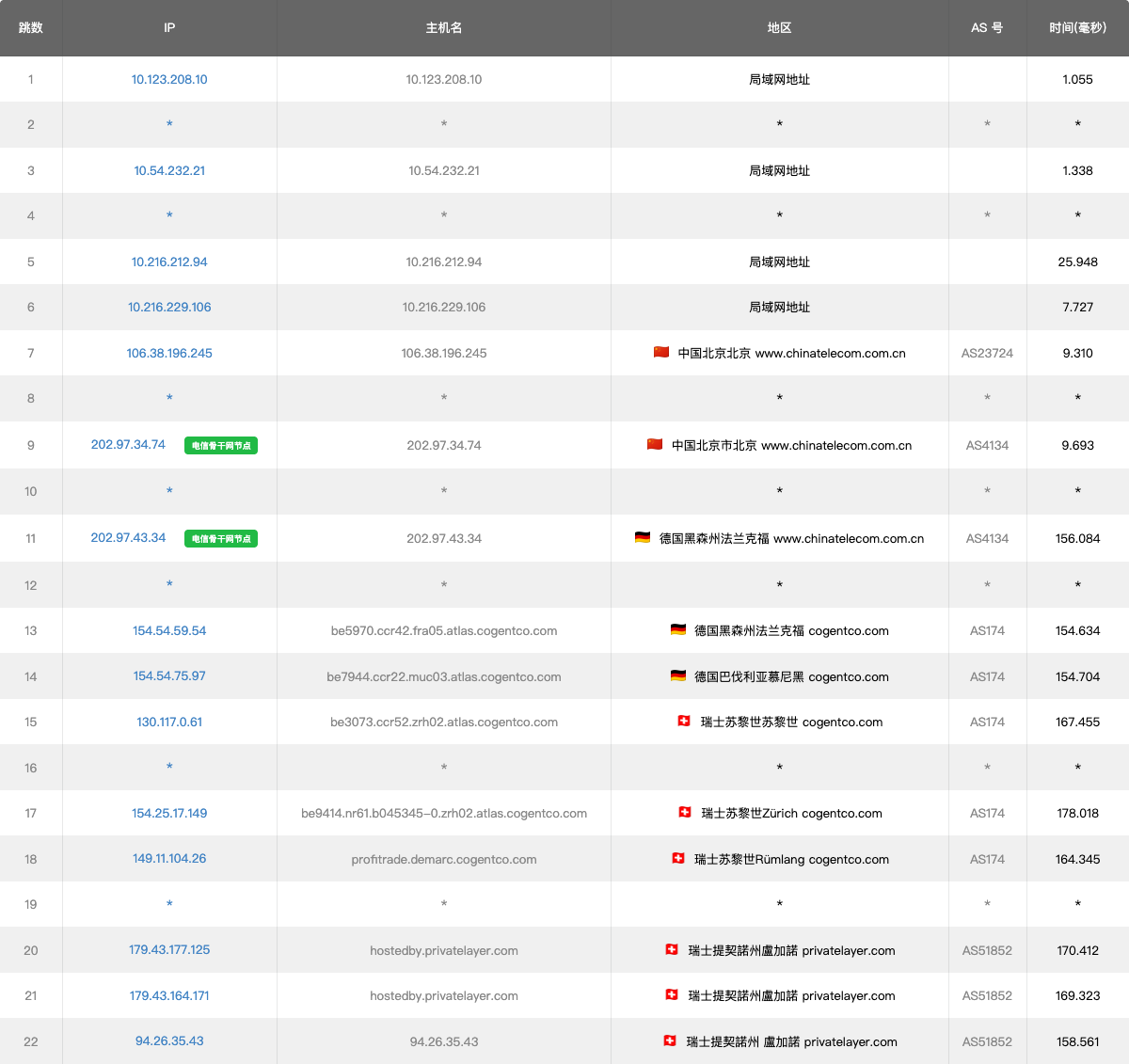 7 10.49ms 154.54.*.* AS174 [COGENT-BONE] 德国 巴伐利亚 慕尼黑 cogentco.com