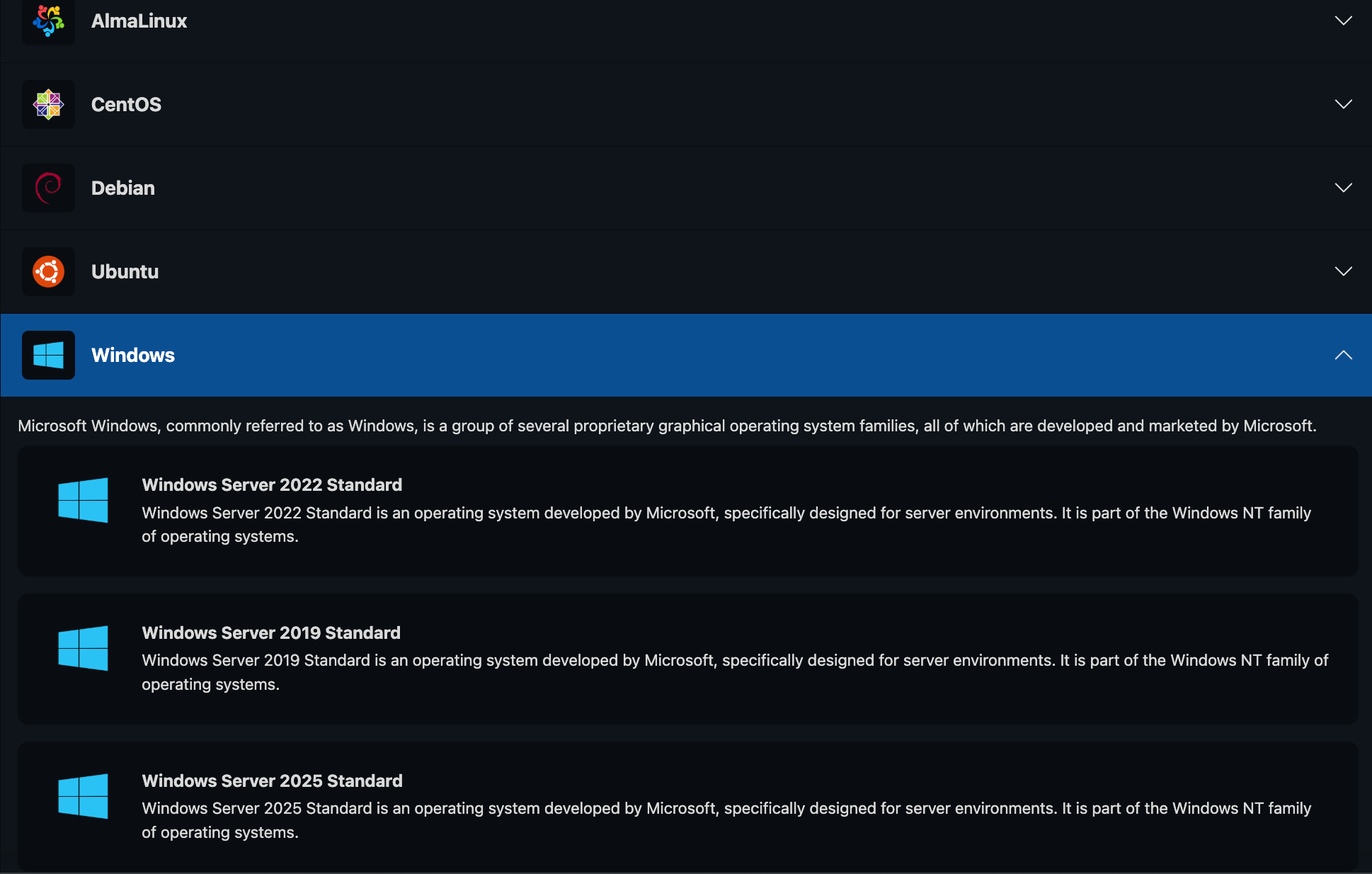 系统的选择上比较丰富,基本平时需要的系统类型都涵盖到,从Ubuntu到Debian和Centos,再到Windows系统(Windows2019、Windows2022、Windows2025)不支持自定义上传安装ISO系统。