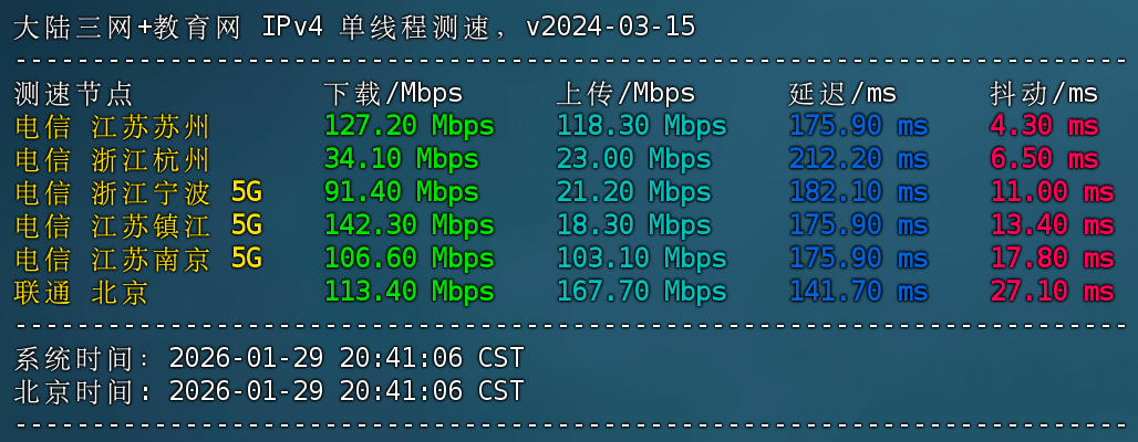 三网+教育网 IPv4 单线程测速