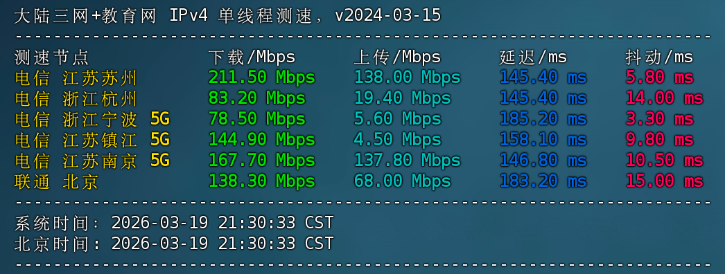 三网+教育网 IPv4 单线程测速