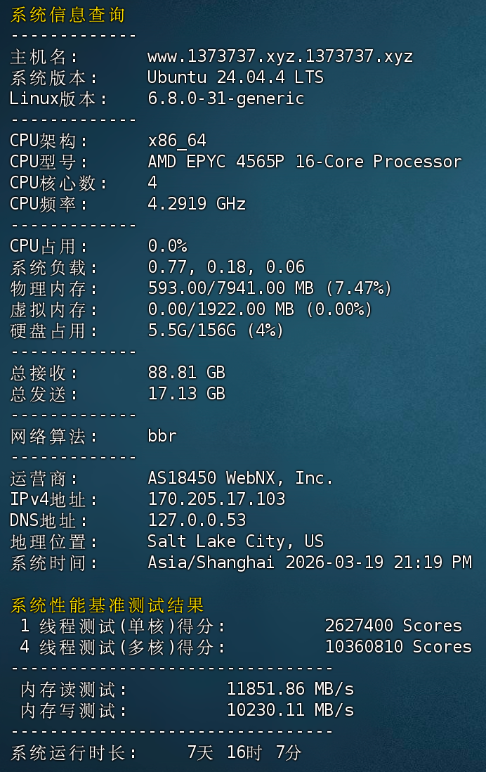 测试机器信息:VPS-3套餐,$25/月(4核,8G内存,160GB NVMe SSD,8T流量,10 Gbps带宽)
