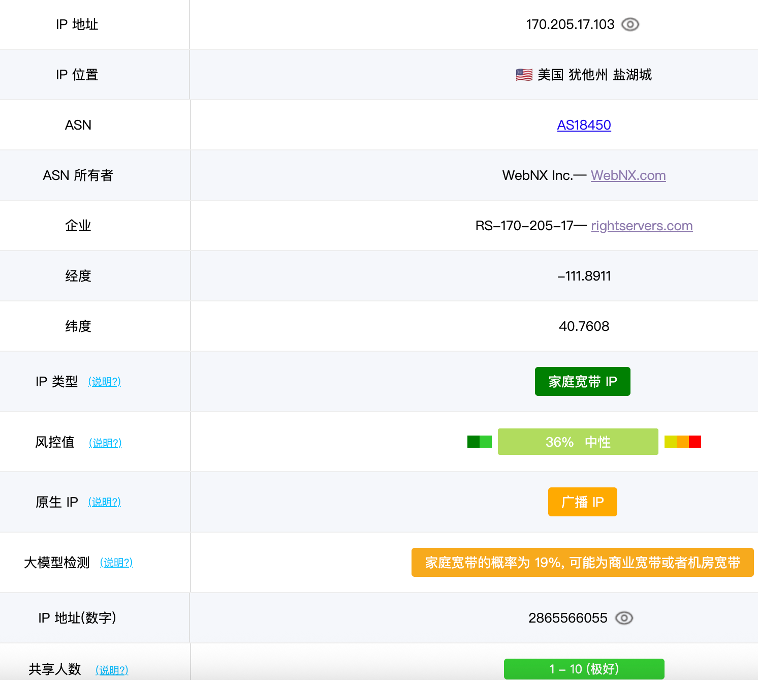 1 0.10ms 170.205.*.* AS18450 美国 犹他州 盐湖城 WebNX.com