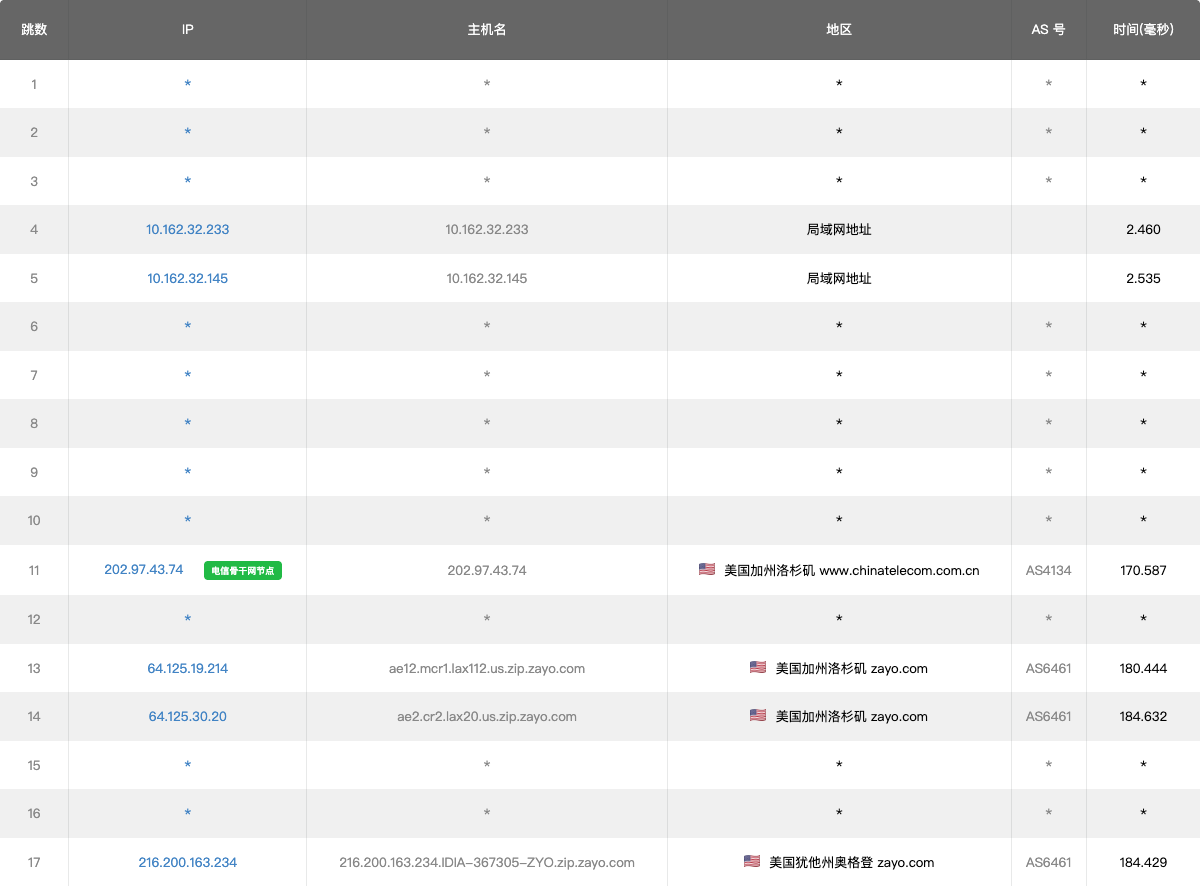 6-7 16.78ms 184.104.*.* AS6939 [HURRICANE-11] 美国 加利福尼亚 洛杉矶 he.net