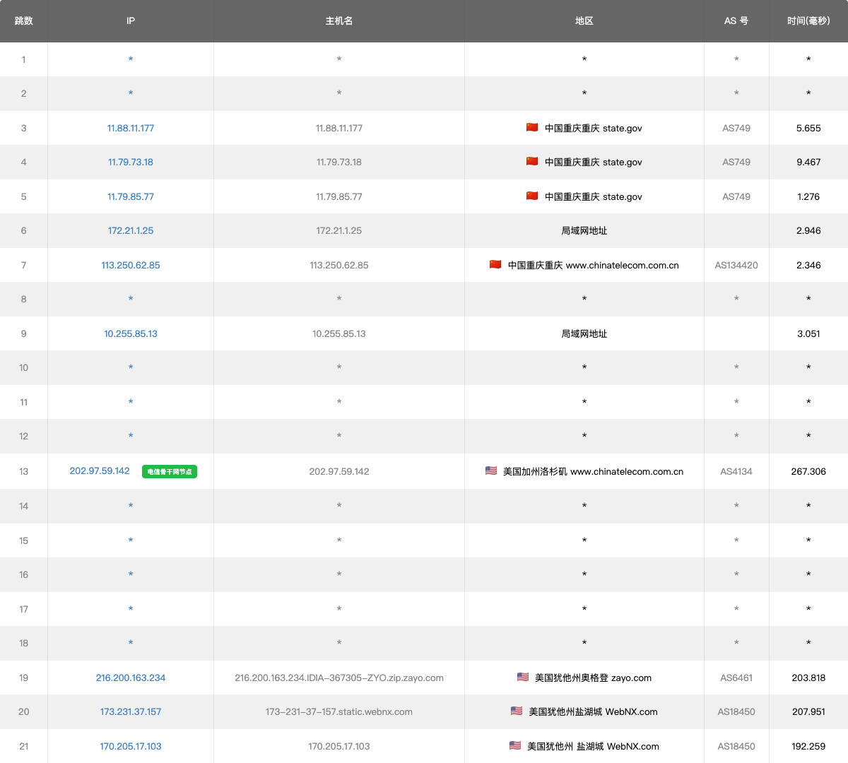 9-11 155.80ms 202.97.*.* AS4134 [CHINANET-BB] 中国 北京 chinatelecom.com.cn 电信