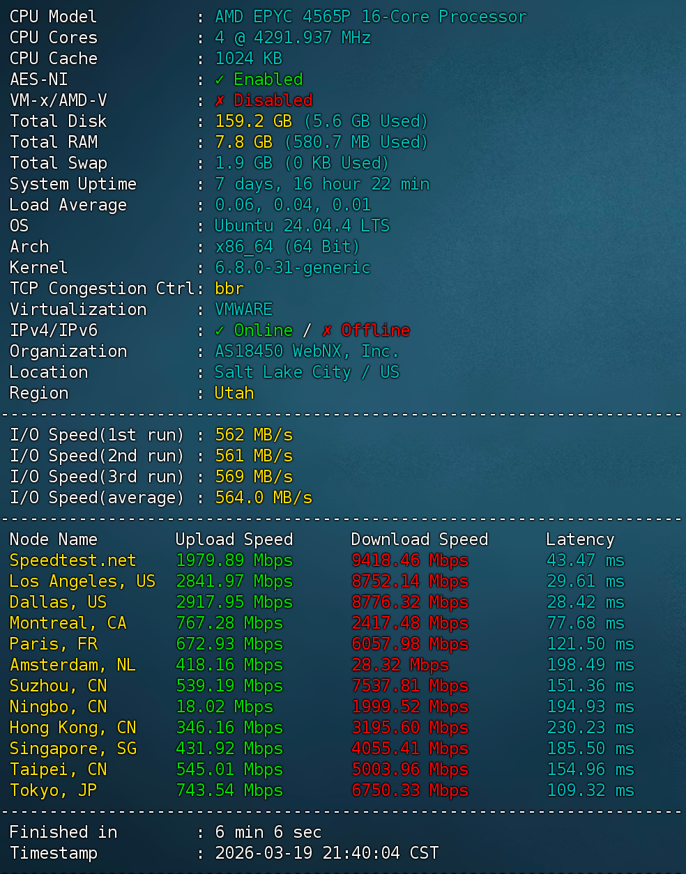 总结:先说速度,晚高峰下载速度也不差,虽说不是跑满,但也速度也是能接受的范围内,普通上网或者偶尔下载文件也是够用的,但上传被限速在3Gbps左右,所以比较适合做下载缓存、北美CDN节点或文件分发服务这些。流媒体方面,YouTube也能做到4K秒开,Disney+、Netflix、Hulu、FOX、这些也全部解锁,AI服务方面ChatGPT、Google Gemini、Claude这些也全部可用。回程路由来说,电信路径走Arelion/GTT → 163,联通路径走Level3/HE → 4837,移动路径走Level3/Zayo → CMI,比较建议移动用户选择。我觉得如果只是普通上网用不上这个配置,如果有文件分发服务或者下载缓存这种的比较适合我测试的这个套餐,不然即使最低配置的也要$5一个月,还要只有1 TB流量,还不如看看不限流量服务器那个列表的套餐。