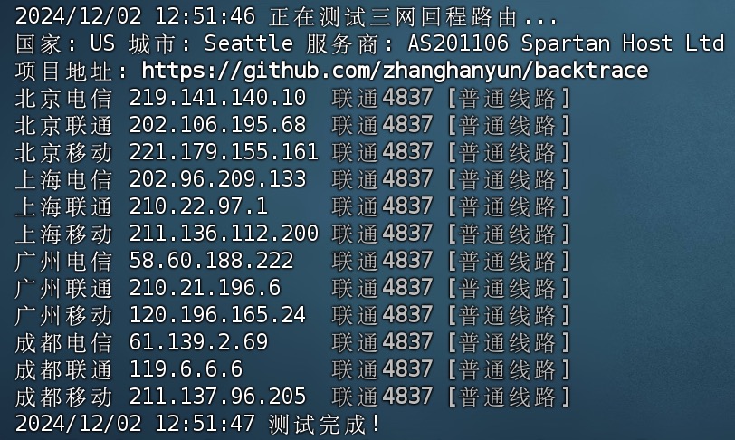 三网回程线路测试,回程线路是使用联通的,这个确实是中国优化线路